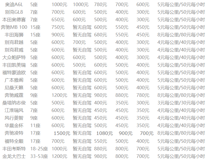 2.如需返程加收单程价格的30%和路费,包车超时按每小时60元计算,包车不含路桥,停车费和油费,以上价格含税。